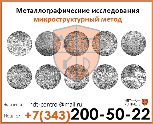Микроисследование (металлография микроструктурным методом) –вид разрушающего контроля, подразумевающий исследование микроструктуры металла и его строения под оптическим микроскопом с увеличением в 50-2000 раз. Микроструктурный анализ металла выполняется на шлифах с отполированной и отшлифованной до блеска поверхностью, протравленной специальными растворами. Наличие темных пятен разнообразной формы на белом фоне шлифа говорит о наличии неметаллических включений в материале. Тонкие извилистые кривые – это микротрещины, а черные пятна – это газовые поры.